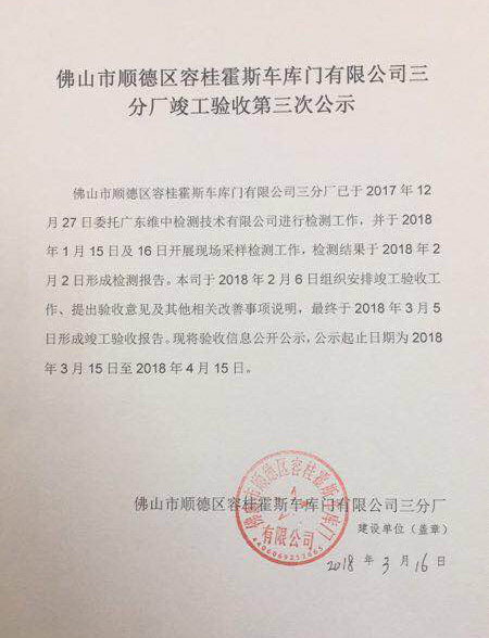 佛山市霍斯智能控制科技有限公司三分廠竣工驗收第三次公示